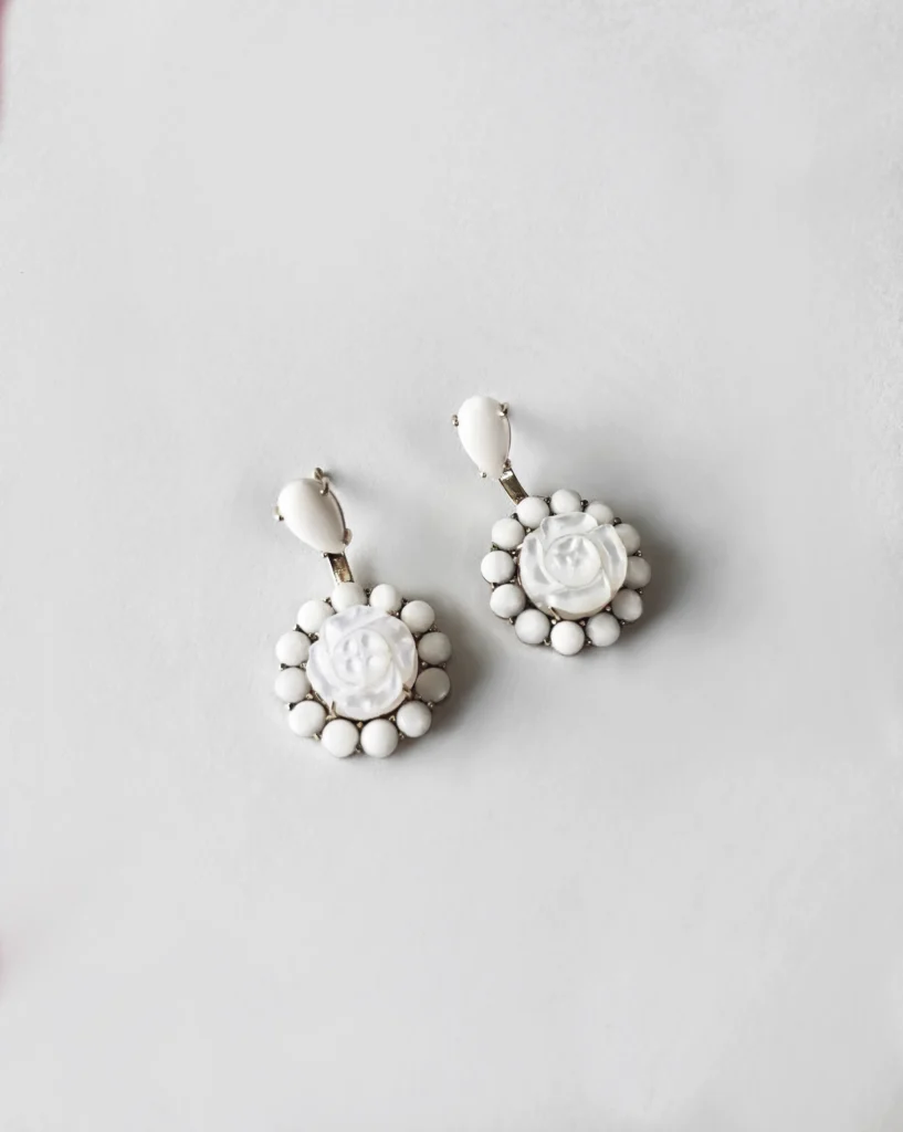 Pearl drop Earrings are a refined blend of elegance and artistry. These earrings showcase intricately carved mother of pearl floral studs set in 18k gold- plated metal. A refined blend of elegance and artistry, finished with a unique double-ended backing Pearl drop Earrings are a refined blend of elegance and artistry. These earrings showcase intricately carved mother of pearl floral studs set in 18k gold- plated metal. A refined blend of elegance and artistry, finished with a unique double-ended backing