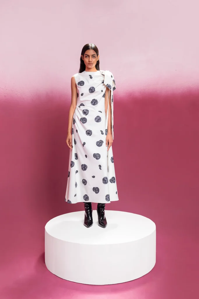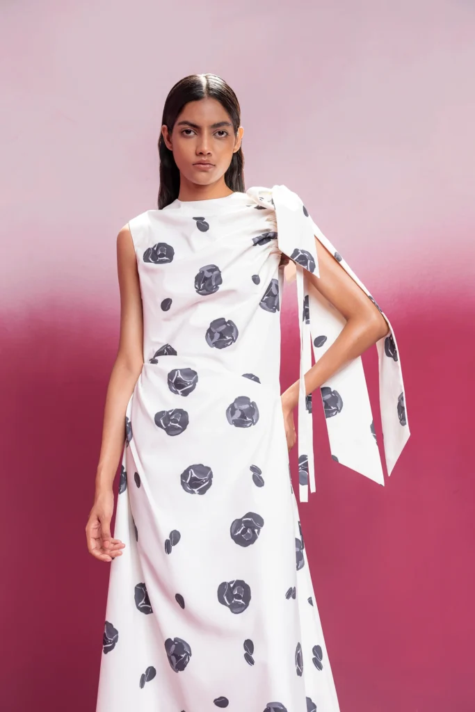 A timeless one-shoulder tie dress with delicate prints and a flattering silhouette
